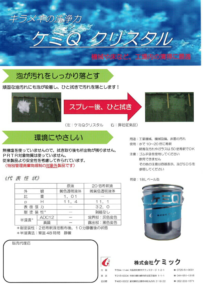 強力アルカリ性水溶性洗浄剤 ケミQクリスタル 18L [特長] ・PRTR対象物質不使用(特別管理廃棄物規制の対象外製品) ・環境にやさしい(無機塩不使用の為、拭き取り後も析出物が残りません。