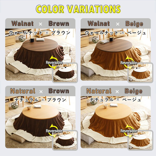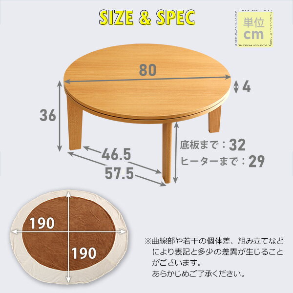 【素材】 こたつ本体:天板:PVCシート、パーチクルボード 脚:MDF、PVCシート こたつ布団:側生地:表地、裏地:ポリエステル100% 詰め綿ナシ 【商品サイズ】 こたつ本体:直径80x36cm こたつ布団:直径190m(許容範囲+5%・-3%) 【商品重量】 17kg 【梱包サイズ】 83×83.5×14.5cm 【梱包重量】 18.5kg 【カラー】 本体:ナチュラル(NA)、ウォールナット(WAL) 布団:ベージュ、ブラウン 【生産国】 インドネシア 【その他】 ヒーター200W / 面状カーボン / 電源コードON・OFF 天板の厚み:1.5cm